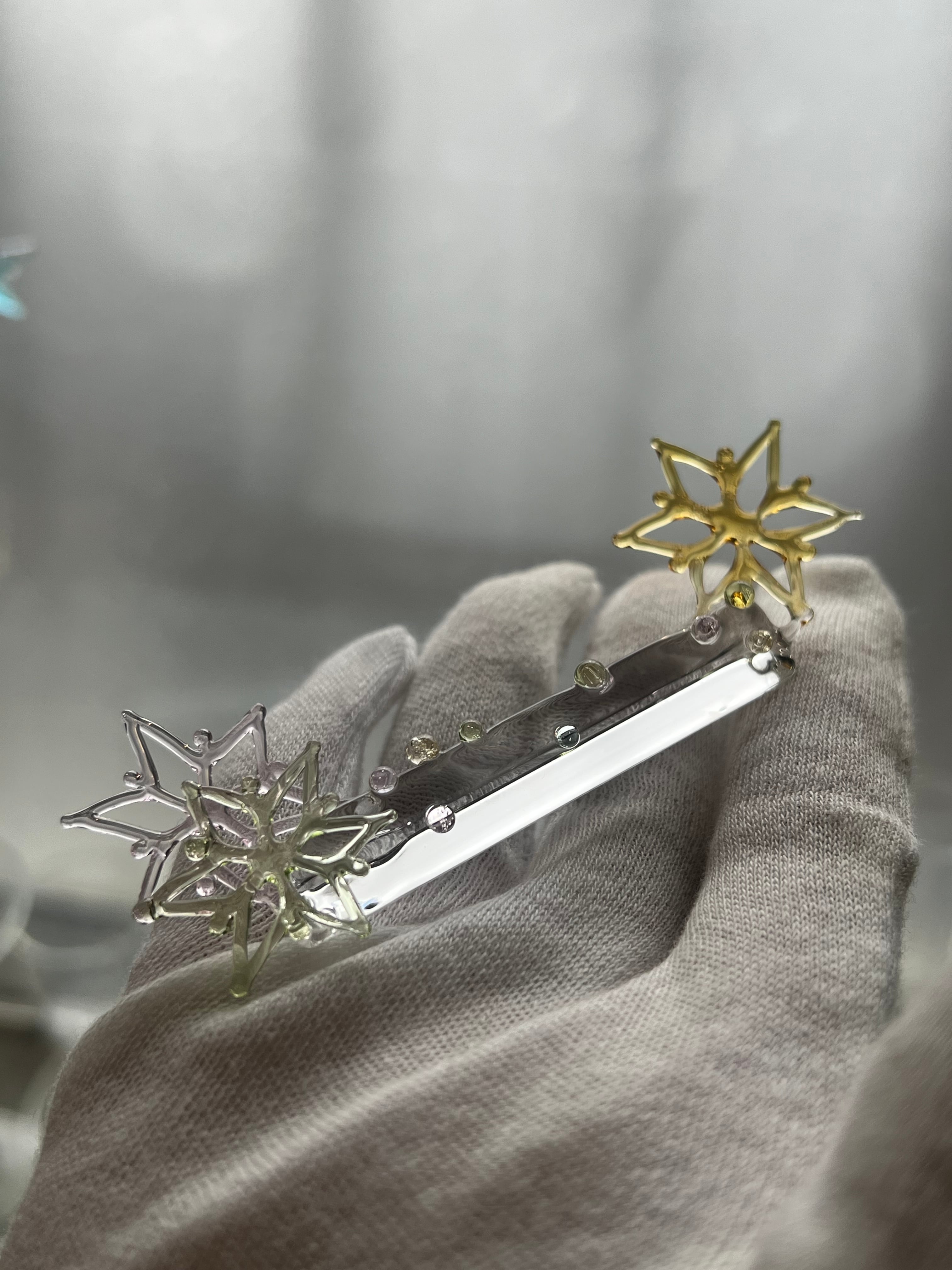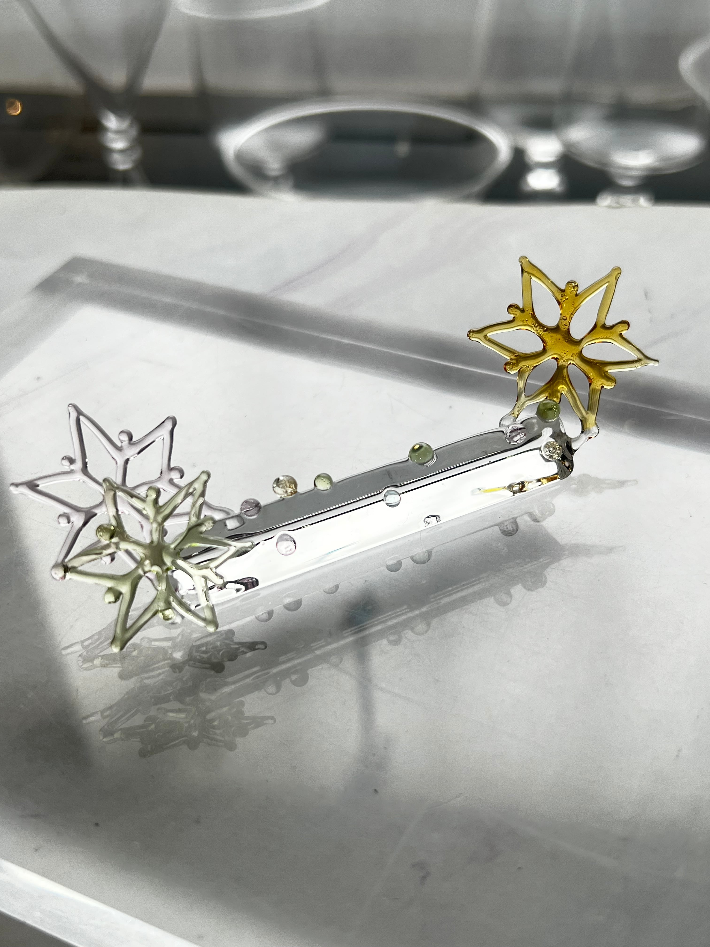 耐熱ガラスstringer work で制作された雪の結晶のペンレスト